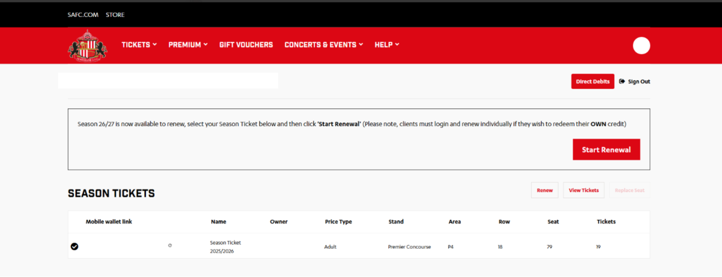 If your renewal has already been completed, no renewal prompt will be shown and you will see the 2026/27 season ticket